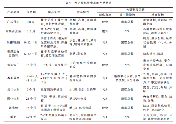 通常,富含脂肪的食品因?yàn)橛椭难趸纸饣蚓酆隙菀姿釘?;果蔬類食品因?yàn)槊复俸肿兌鴮?dǎo)致色澤和風(fēng)味的衰敗;含糖量較高的食品因?yàn)榛瘜W(xué)水解或美拉德反應(yīng)而導(dǎo)致質(zhì)構(gòu)、色澤和風(fēng)味的劣敗;不容易導(dǎo)致微生物腐敗的冷藏或冷凍食品,雖然能夠減緩各類化學(xué)反應(yīng)的速率,卻不能真正阻止其發(fā)生,相反還會(huì)因?yàn)樗值倪w移、凍傷的形成而改變狀態(tài)和口感。表1 整理了日常生活中常見的一些預(yù)包裝食品的產(chǎn)品特性。