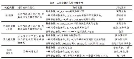 在新產(chǎn)品上市之前的研發(fā)階段,依據(jù)不同的產(chǎn)品特性和生產(chǎn)、儲(chǔ)運(yùn)、銷售環(huán)節(jié)中劣變機(jī)制的研究,快速準(zhǔn)確地預(yù)測出食品保質(zhì)期是非常重要的。針對(duì)表1中常見預(yù)包裝食品的關(guān)鍵變質(zhì)因素,表2列舉了常用的保質(zhì)期試驗(yàn)變量及其條件設(shè)置參考。