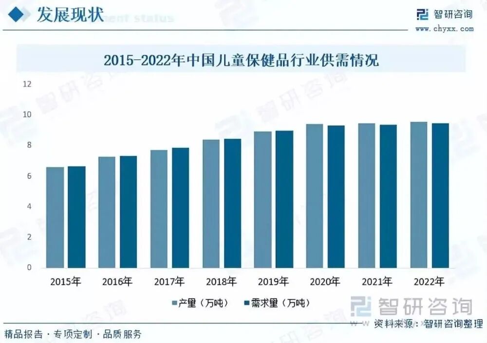 相比于歐美等國家,我國兒童保健食品市場起步較晚,但近年來行業發展十分迅速。隨著我國人均收入水平不斷提高,家長對孩子的營養及保健重視度增強,兒童保健食品市場的規模不斷壯大。尤其在此次新冠肺炎疫情的蔓延下,家長對兒童保健食品需求增大,尤其是提高免疫力等保健產品需求將大大增加。據資料顯示,近年來我國兒童保健品產量及需求量整體呈上升的趨勢,具體來看,2022年我國兒童保健食品產量為9.58萬噸,同比增長1.2%;需求量為9.46萬噸,同比增長1.1%。