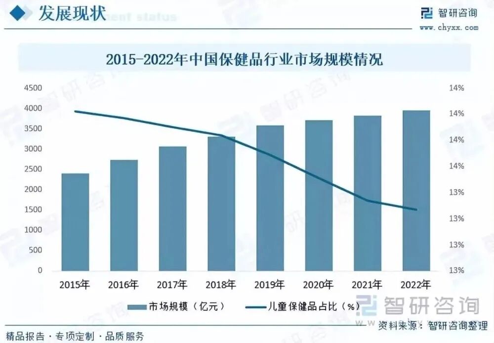 隨著近年來我國經濟的不斷發展,健康中國理念的不斷推行,人們對健康的愈發重視。同時,隨著我國人口老齡化程度的不斷加深,老年人群體的比重越來越高,使得健康、營養、個性、便捷等成為大眾關注的熱點,保健食品行業也隨之快速發展。據資料顯示,2022年我國保健食品行業市場規模為3946.8億元,同比增長3%。其中兒童保健食品占比為13.27%。